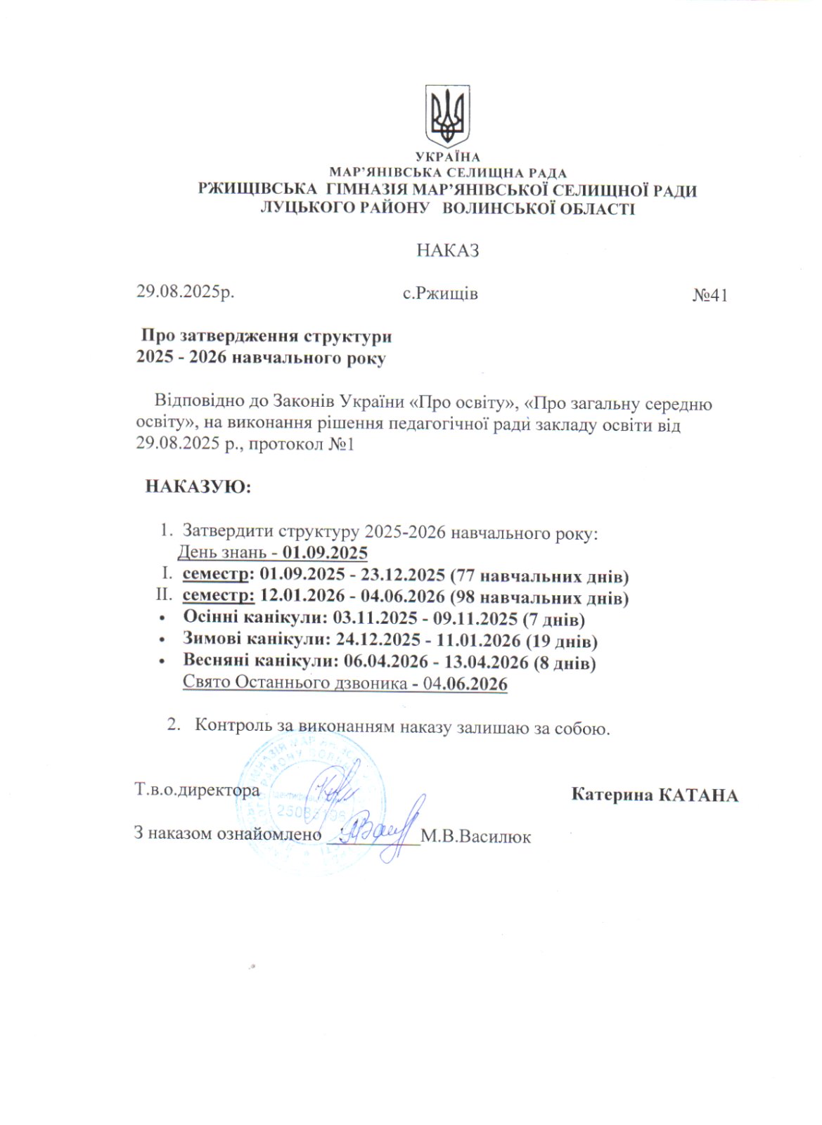 Наказом від 29.08.2024р. №60 “Про організацію освітнього процесу та режиму роботи закладу освіти на 2024/2025рр.” по КЗ “Ржищівська гімназія Мар`янівської селищної ради” затверджено структуру та режим роботи закладу освіти.